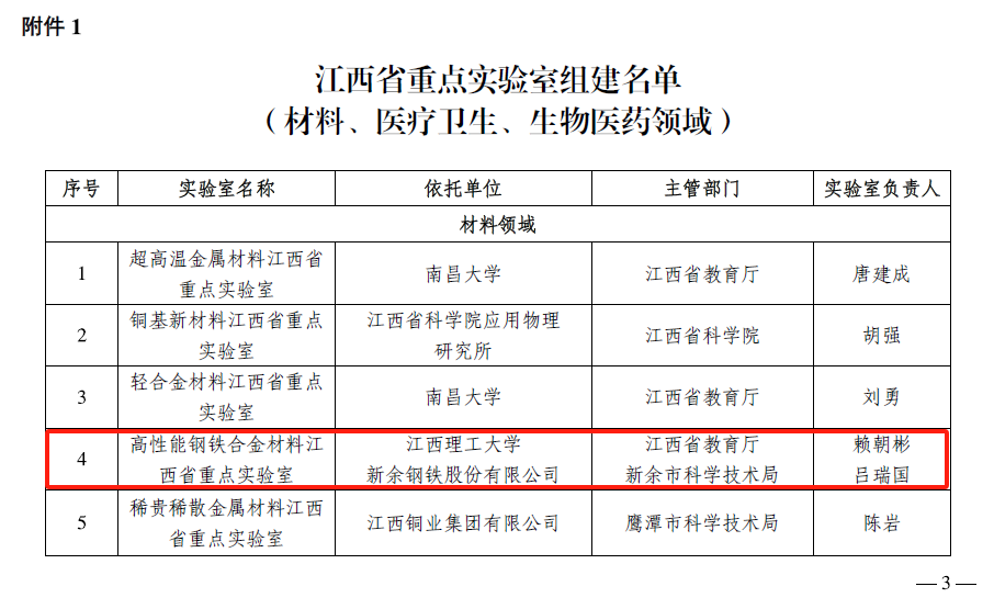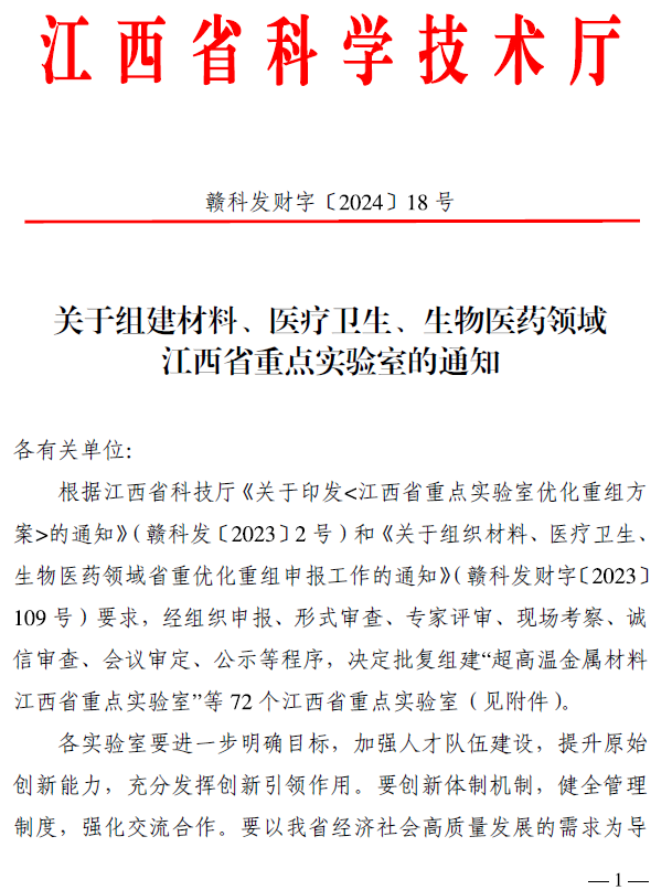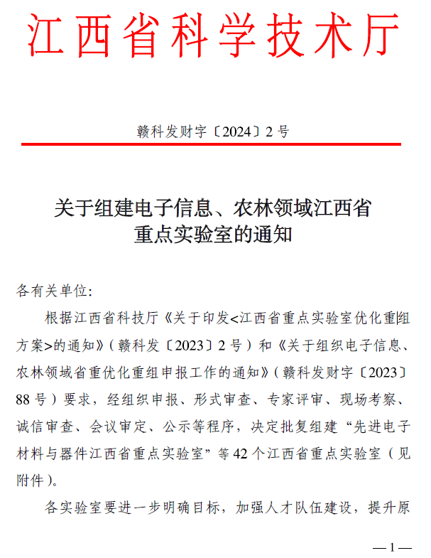本网讯  近日,江西省科技厅下发了《关于组建电子信息、农林领域江西省重点实验室的通知》(赣科发财字〔2024〕2号)和《关于组建材料、医疗卫生、生物医药领域江西省重点实验室的通知》(赣科发财字〔2024〕18号),大发娱乐 申报的多维智能感知与控制江西省重点实验室、功能晶态材料化学江西省重点实验室、金属磁性材料及器件江西省重点实验室、高性能钢铁合金材料江西省重点实验室获批组建。