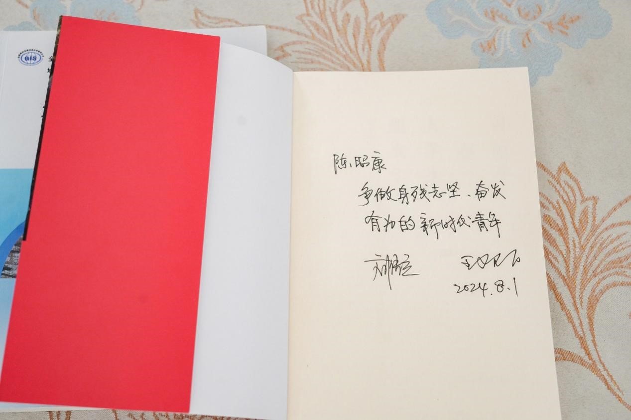 书记和院长共同寄语并亲笔签名,希望他向书中的无臂大学生黄道亮学习,身残志坚,以非凡的毅力克服重重困难,成为新一代地理信息科学的创新人才,在奋斗中实现自己的青春梦想。