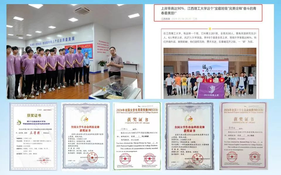 赣江创新研究院稀土重点实验室第二届夏令营”活动,遴选学生参加沪扬2024年寒假“国际组织实习生预备营”和“寒假名校进名企——新加坡”活动。今年以来,学生在竞赛类活动中荣获省级以上奖项36人次,稀土201班全班共30人,推免攻读研究生21人,6人考研上岸,班级升学率高达90%。