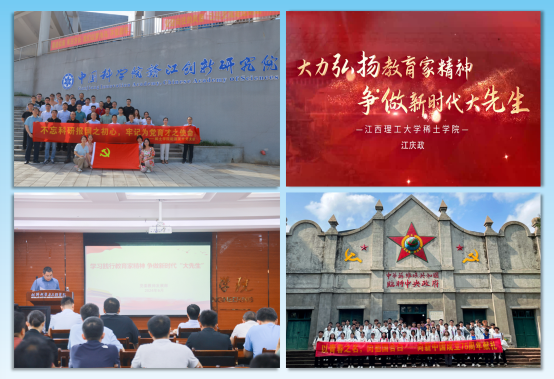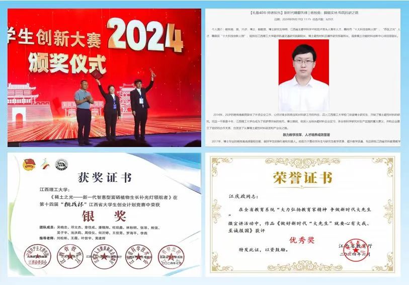 高层次人才引领带头作用充分发挥,稀土磁材党支部书记马胜灿教授荣获“宝钢优秀教师”、校级优秀研究生指导教师,青年党员杨牧南博士被省委组织部确认为2024年度“新时代赣鄱先锋”之“群众身边好党员”学习宣传对象,江庆政教授荣获“大力弘扬教育家精神 争做新时代大先生”微宣讲视频征集活动优胜奖,杨凤丽教师获评首批江西省校企合作一流本科课程,刘松彬教师荣获江西省大学生创新大赛(2024)冠军和第十四届“挑战杯”江西省大学生创业计划竞赛银奖。