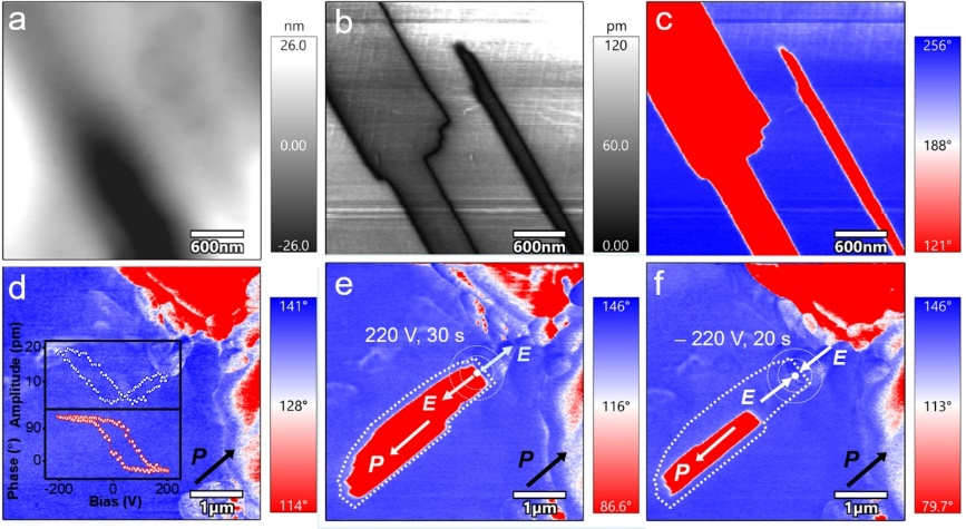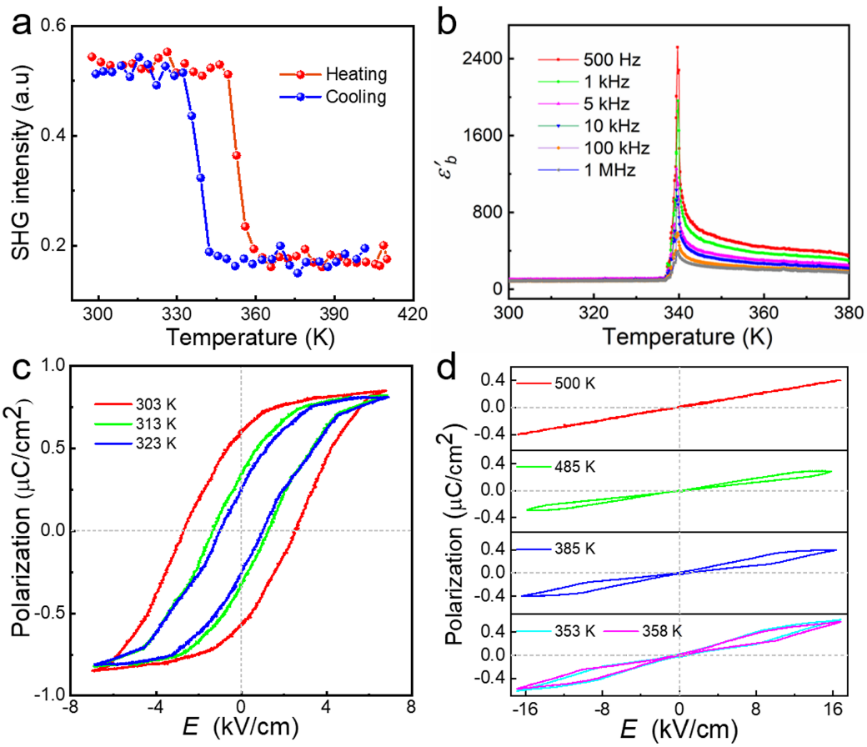 有机-无机杂化分子材料具有丰富的结构自由度,允许局部偶极子的各种立体取向,为实现非共线性电极化提供了分子基础。缪等设计了有机-无机杂化分子晶体(DABCO)2BrClO4,其中含有层状排列的偶极Br···[H2Dabco]氢键链(图1)。研究表明,由于氢键是弱相互作用,同一层中Br···[H2Dabco]可以形成相互转化的极化方向不同的氢键链。在室温时,只出现互为60°扭转角的两种氢键链层,晶体表现铁电的自发极化(图1d); 而在较高温度时,新的氢键链重新形成,晶体中出现互为60°扭转角的六种极化方向的氢键链,自发极化消失;然而这些氢键链能在电场下转化为只有两种偶极方向氢键链,表现出反铁电行为 (图2)。不同于通常的铁电体和反铁电体,该分子晶体的铁电相和反铁电相中偶极子是非共线的。这种独特的电极化开关模式导致低的郊顽场,在信息存储器件领域显示应用潜力。该研究不但揭示了非共线极化的独特科学意义,也为寻找丰富的非共线极化提供了有效途径。