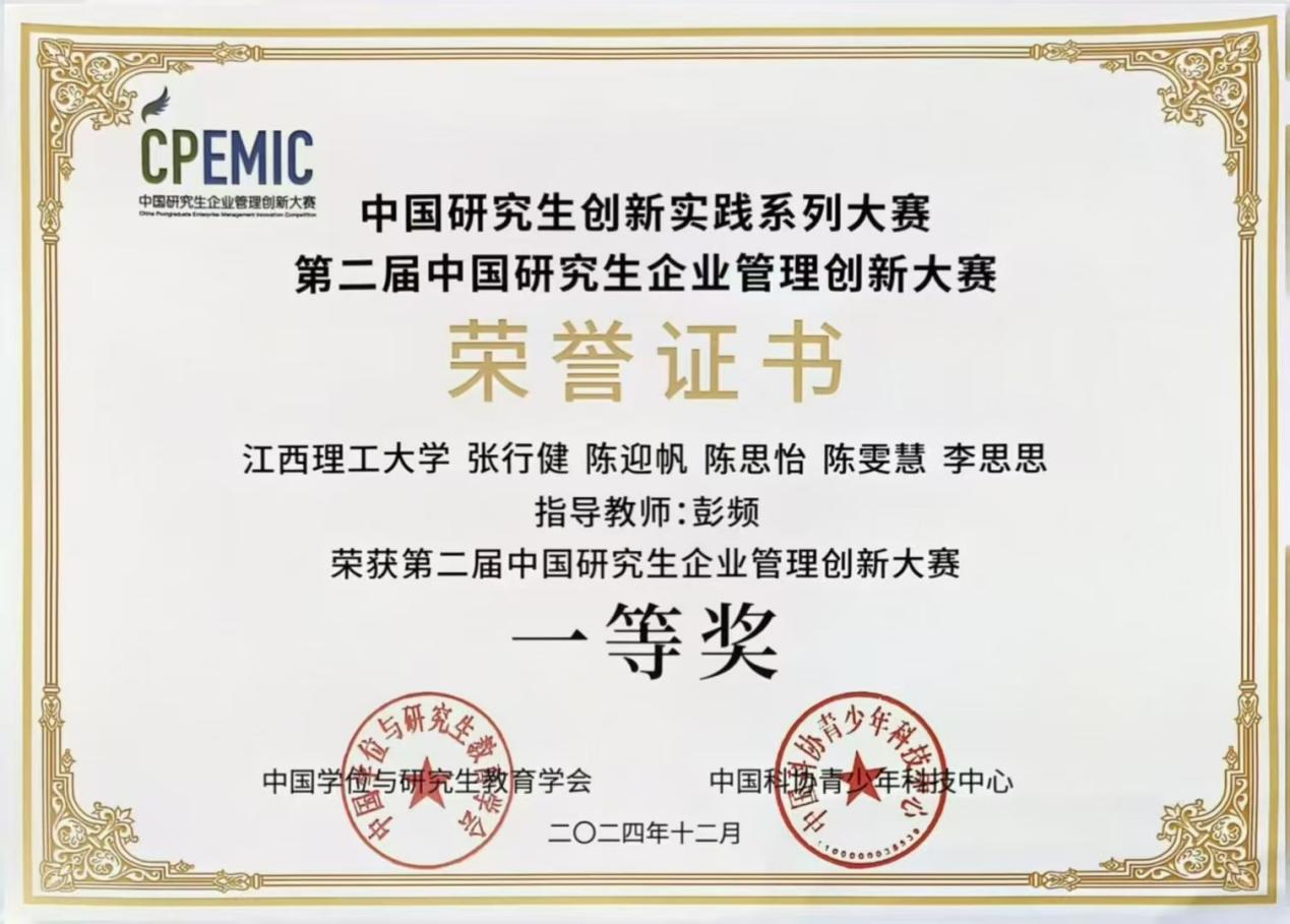 研究生张行健、陈迎帆、陈思怡、陈雯慧、李思思组成的参赛团队(指导老师:彭频)荣获大赛一等奖。