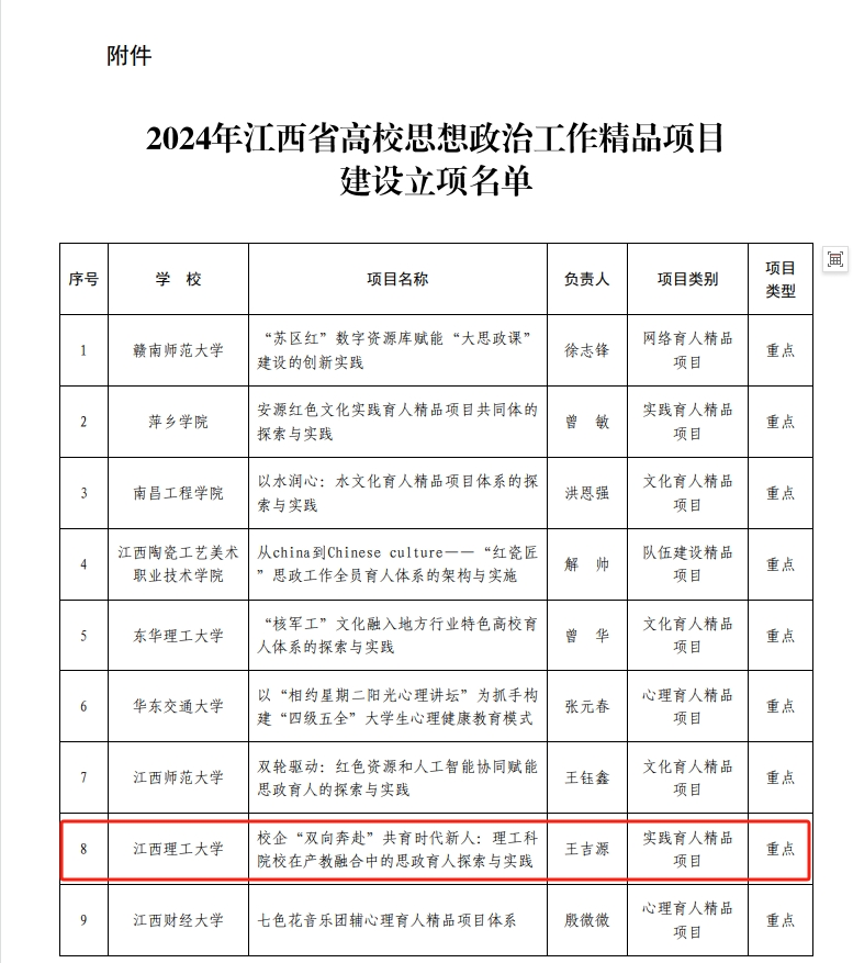 本网讯 近日,江西省教育厅公布了2024年江西省高校思想政治工作精品项目建设立项名单。大发娱乐 有两项项目入选2024年江西省高校思想政治工作精品项目建设立项名单。