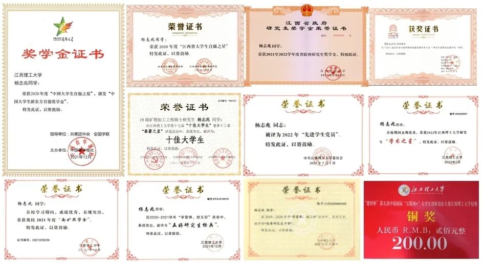 大道至简,实干为要。新时代新征程是充满光荣和梦想的远征,没有捷径,唯有实干。无论是在校园,还是在矿山一线,杨志兆都时常与夜色为伴,沉浸在学术探索中直至凌晨三四点。他的勤奋和执着,是对梦想的不懈追求,也是对自我价值的不断实现。他坚持把论文写在祖国大地上,在科研的道路上,不仅注重实践探索,更重视理论创新。他依托研究成果,累计发表了高水平论文23篇,其中SCI论文11篇,累计被引200余次。这些论文不仅展现了他的学术才华,更为锂资源高效综合利用领域的研究提供了重要的参考和借鉴。