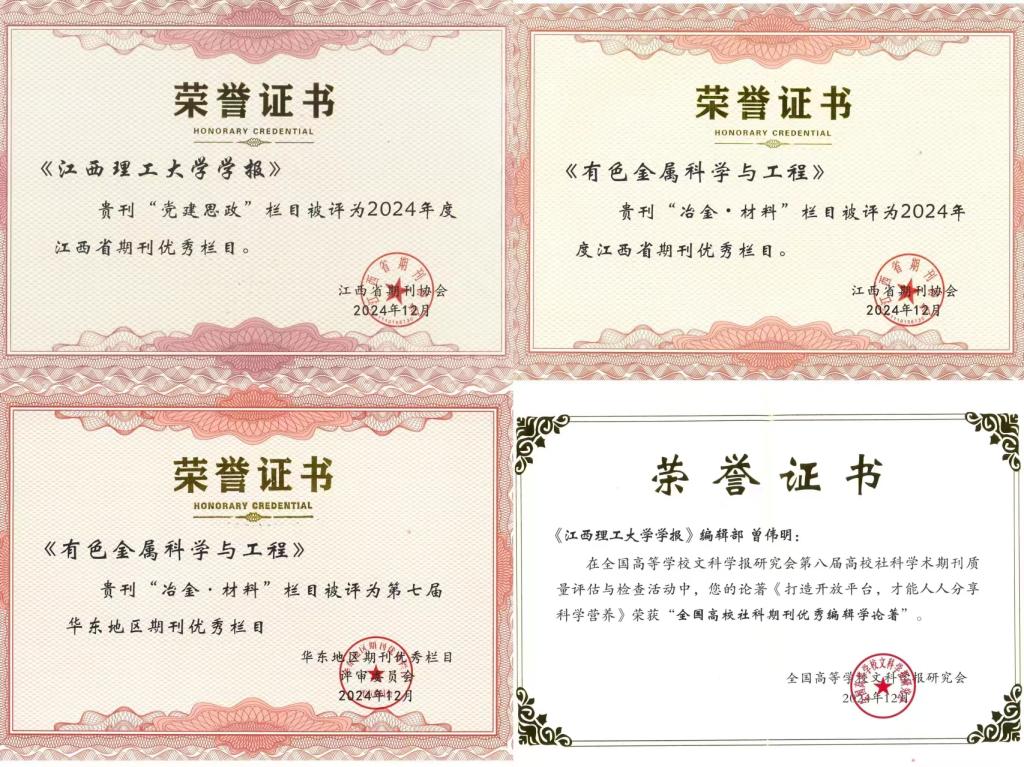 本网讯  近日,江西省期刊协会2024年度理事(扩大会议上传来喜报,《有色金属科学与工程》“冶金·材料”栏目被评为第七届华东地区期刊优秀栏目和2024年度江西省期刊优秀栏目;《大发娱乐 学报》“党建思政”栏目被评为2024年度江西省期刊优秀栏目。此外,第八届高校社科学术期刊质量评估与检查结果发布,大发娱乐 期刊社与出版中心曾伟明主任发表在《光明日报》文章《打造开放平台,才能人人分享科学营养》荣获“全国高校社科期刊优秀编辑学论著”。