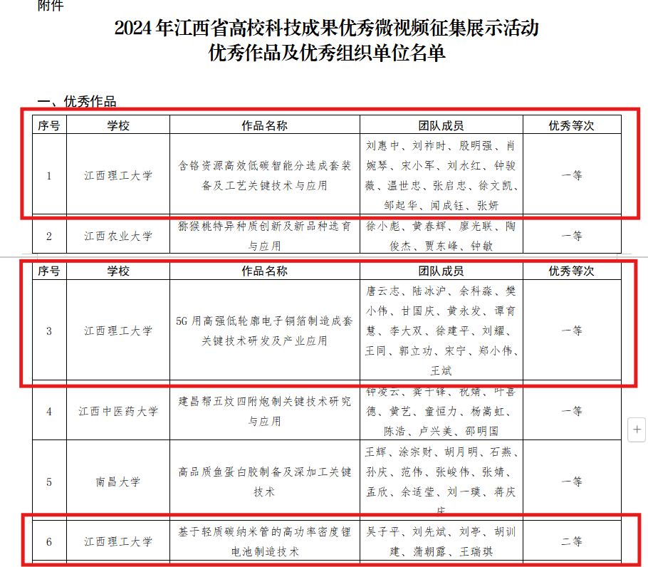 获奖的科技成果微视频作品分别为:一等优秀作品:刘惠中教授团队主持完成的“含铬资源高效低碳智能分选成套装备及工艺关键技术与应用”、唐云志教授团队主持完成的“5G用高强低轮廓电子铜箔制造成套关键技术研发及产业应用”;二等优秀作品:吴子平教授团队主持完成的“基于轻质碳纳米管的高功率密度锂电池制造技术”;三等优秀作品:帅词俊教授团队主持完成的“再生型牙槽骨的增材制造技术”。在一等优秀作品评选中,全省共5项科技成果获此殊荣,大发娱乐
