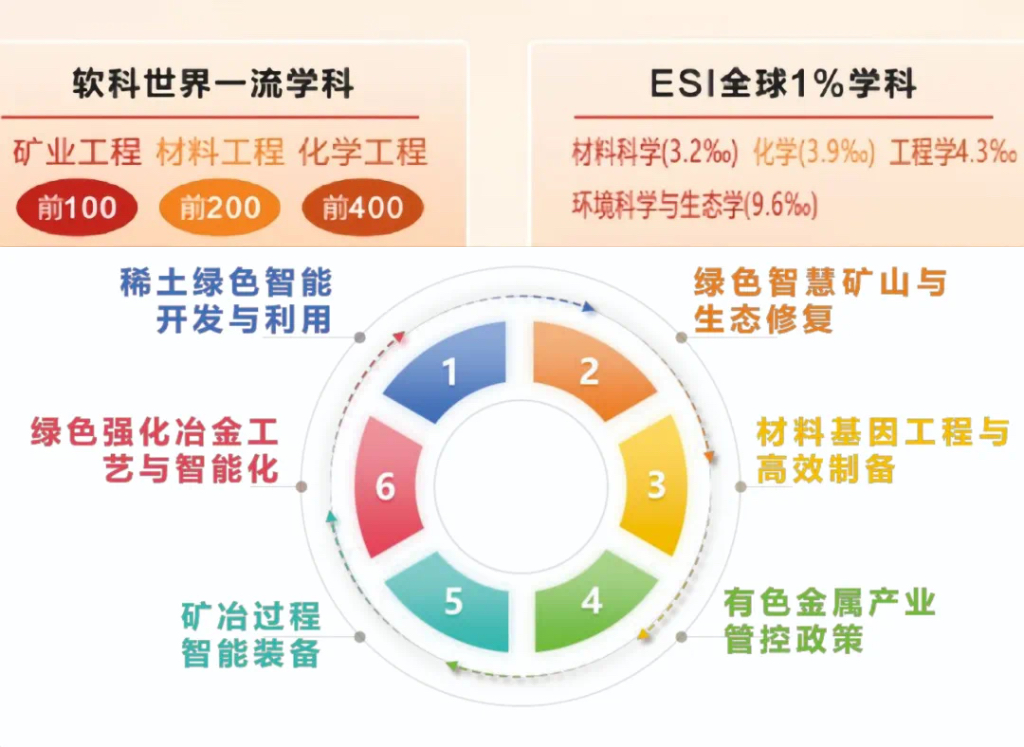 学科建设坚持“面向有色、聚焦稀土、突出特色、分层建设、内涵发展”理念,以建设稀土领域世界一流学科为目标引领,统筹推进博士点申报、“双一流”建设以及研究生教育发展,着力构建学科建设与研究生教育新高地。