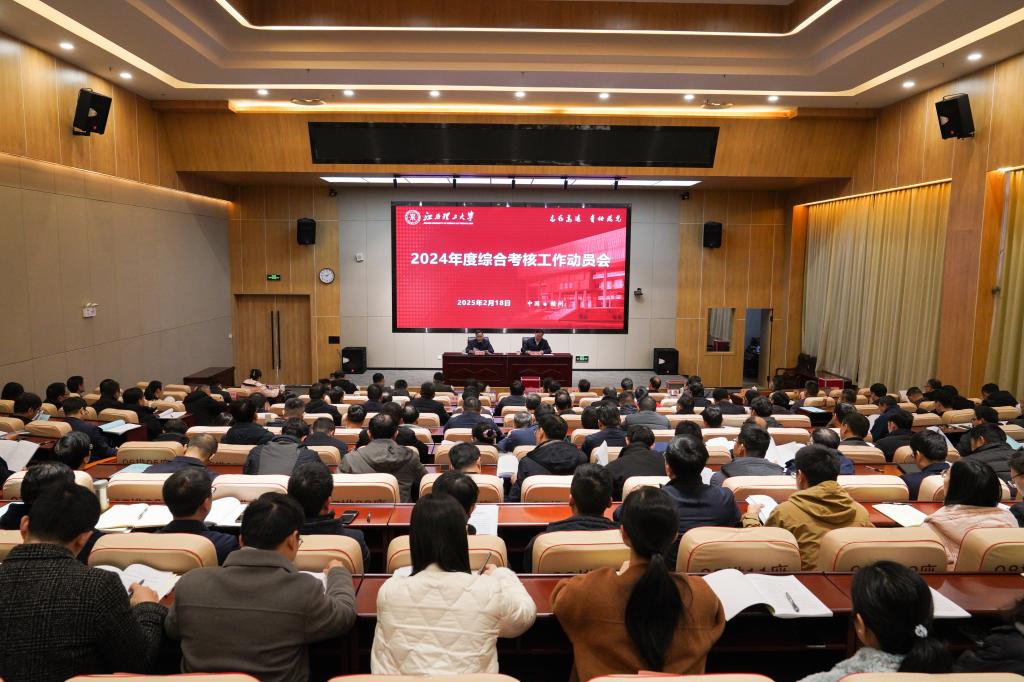 在三江校区启航会议中心召开2024年度综合考核工作动员会。省委第十一考核组组长、省人力资源和社会保障厅党组成员、副厅长叶志忠,考核组副组长、省委组织部信息管理办公室(党员教育中心)主任、一级调研员郭剑斌一行,来校开展2024年度综合考核工作,并对落实党建工作责任制、意识形态工作责任制和干部选拔任用工作进行考核测评。