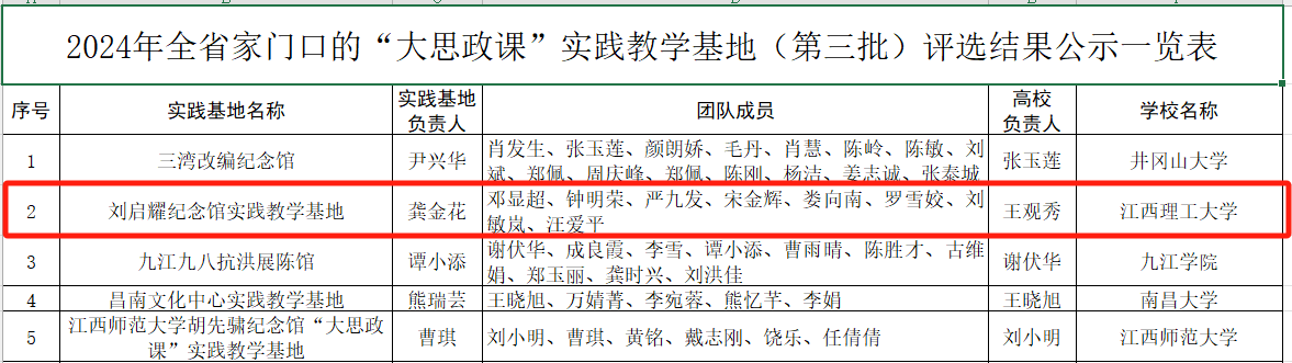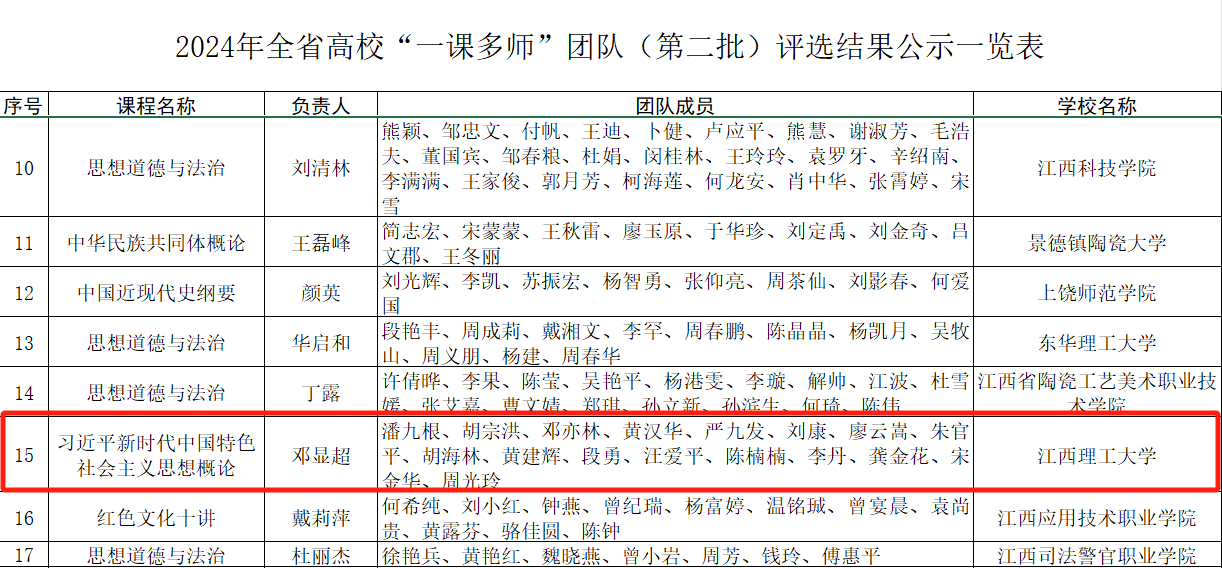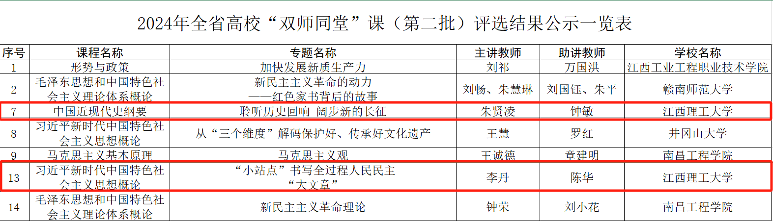 邓显超教授申报的《习近平新时代中国特色社会主义思想概论》课程获批全省“一课多师”团队;龚金花老师申报的刘启耀纪念馆实践教学基地获批全省家门口的“大思政课”实践教学基地;朱贤凌老师和中央红军长征出发纪念馆钟敏老师主讲的《聆听历史回响 阔步新的长征》、李丹老师和章江街道人大工委主任陈华老师讲授的《“小站点”书写全过程人民民主“大文章”》获评全省高校“双师同堂”课;武立敬老师主讲的《建设社会主义生态文明》获评全省“师生同台”课;刘素兰老师申报的《怎样正确认识中华民族迎来了从站起来、富起来到强起来的伟大飞跃》获批全省“专题+艺术”特色思政课。