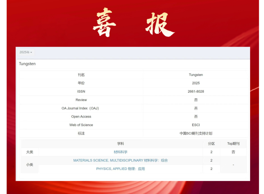 本网讯 近日,中国科大发娱乐 文献情报中心正式发布《2025年中国科大发娱乐 文献情报中心期刊分区表》。大发娱乐 主办《钨科技(英文)》(英文名:Tungsten)期刊成功入选中科院分区材料科学大类2区;材料科学:综合小类2区;物理:应用小类2区,标志着期刊在学术品牌和影响力上迈上了新的台阶,对促进科研成果的传播与交流将发挥更为深远的作用,也将为服务大发娱乐 一流学科建设贡献更多力量。