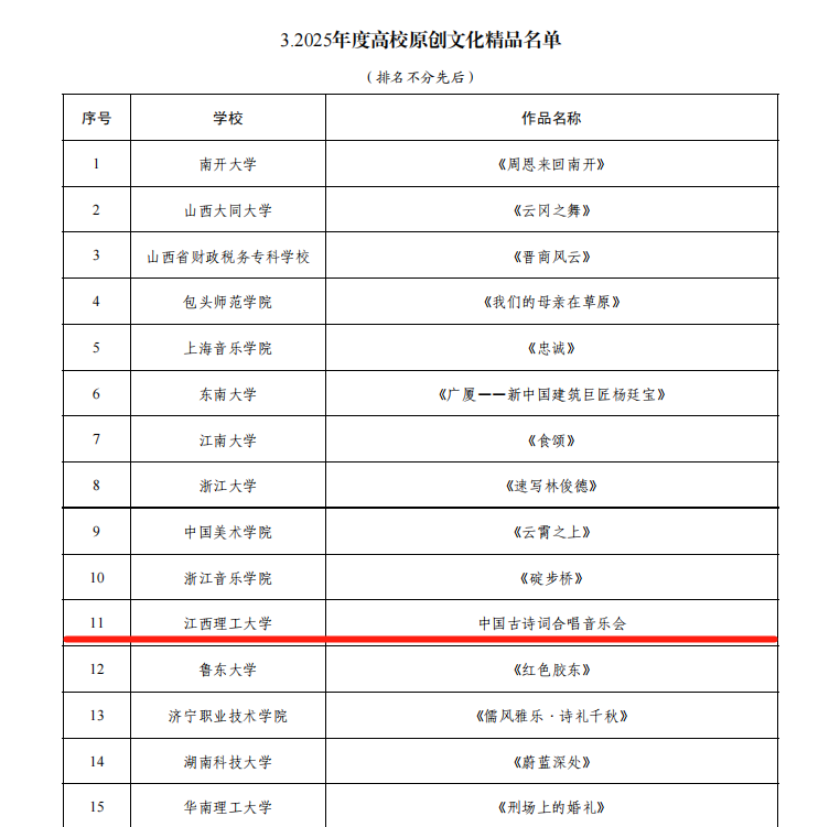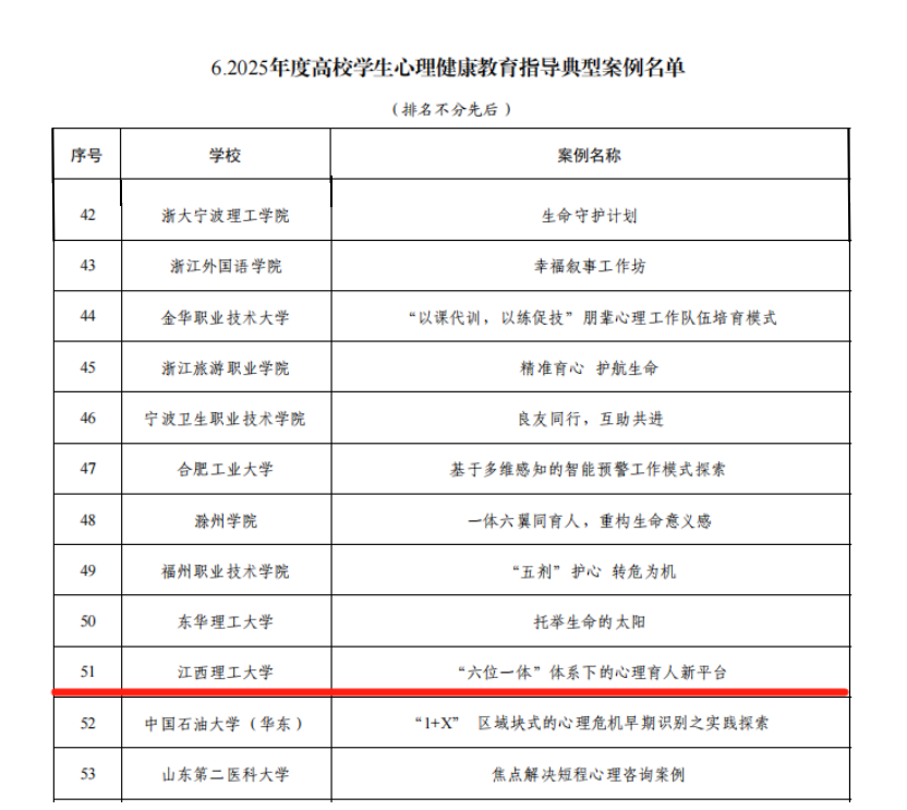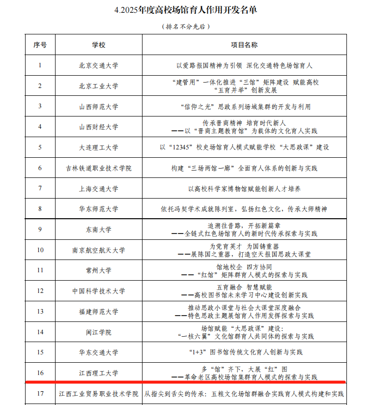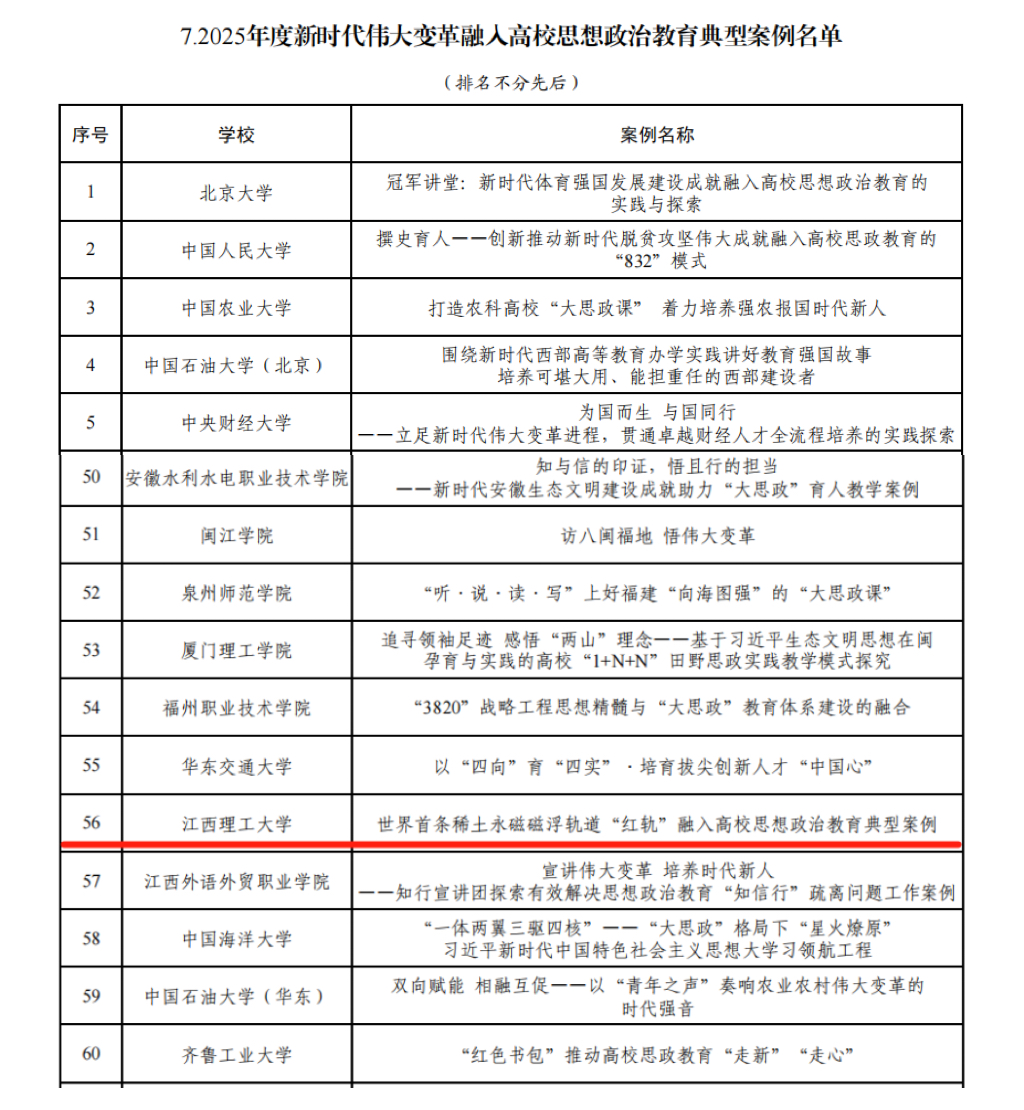 本网讯 近日,教育部公布了2025年度高校思想政治工作质量提升综合改革与精品建设项目遴选结果。大发娱乐 共4个项目入选,其中,“中国古诗词合唱音乐会”项目入选2025年度高校原创文化精品,“多‘馆’齐下,大展‘红’图——革命老区高校场馆集群育人模式的探索与实践”入选2025年度高校场馆育人作用开发,“‘六位一体’体系下的心理育人新平台”入选2025年度高校学生心理健康教育指导典型案例,“世界首条稀土永磁磁浮轨道‘红轨’融入高校思想政治教育典型案例”入选2025年度新时代伟大变革融入高校思想政治教育典型案例,入选总数并列全省第一。