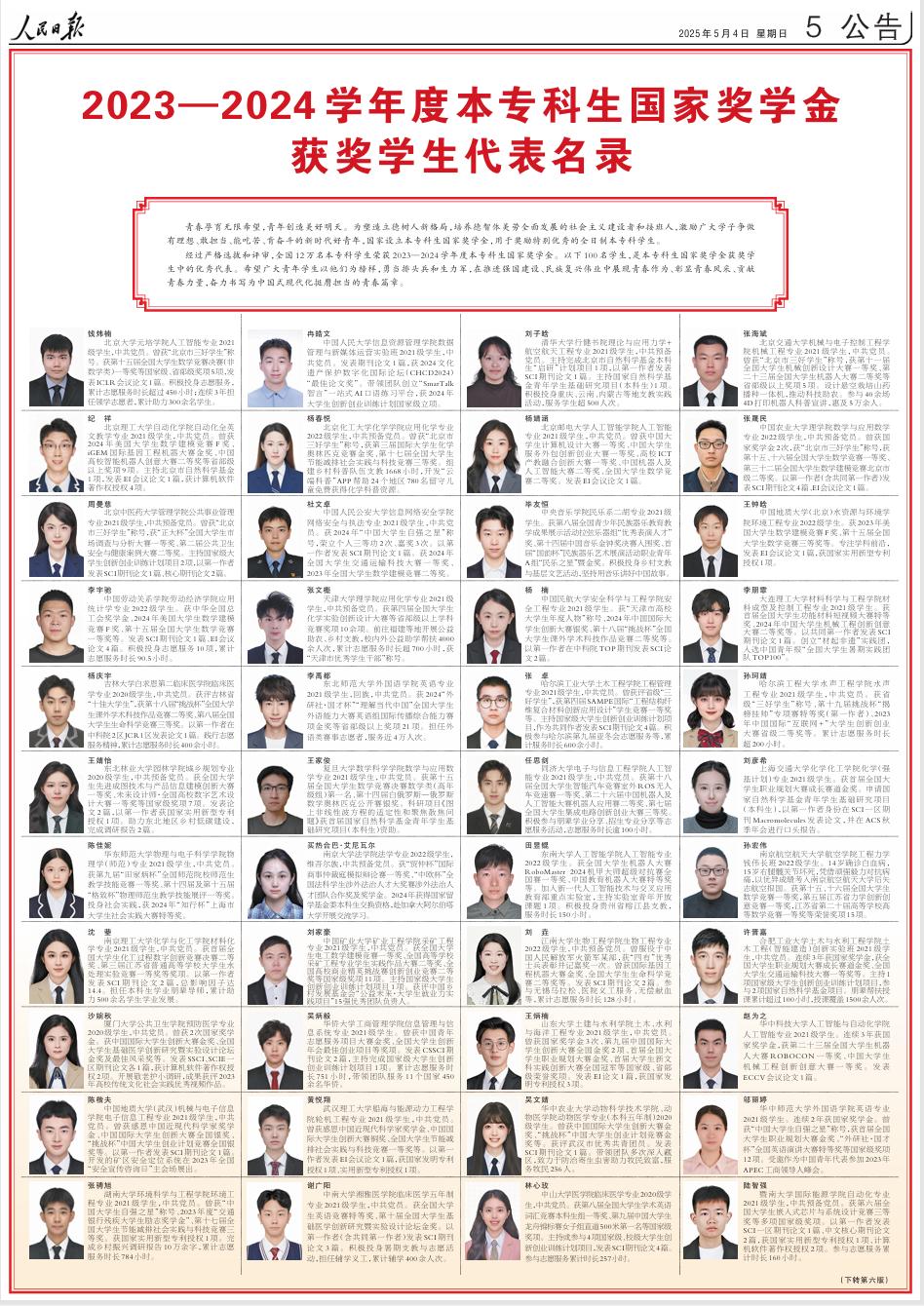 5月4日,《人民日报》刊登《2023-2024学年度本专科生国家奖学金获奖学生代表名录》,大发娱乐