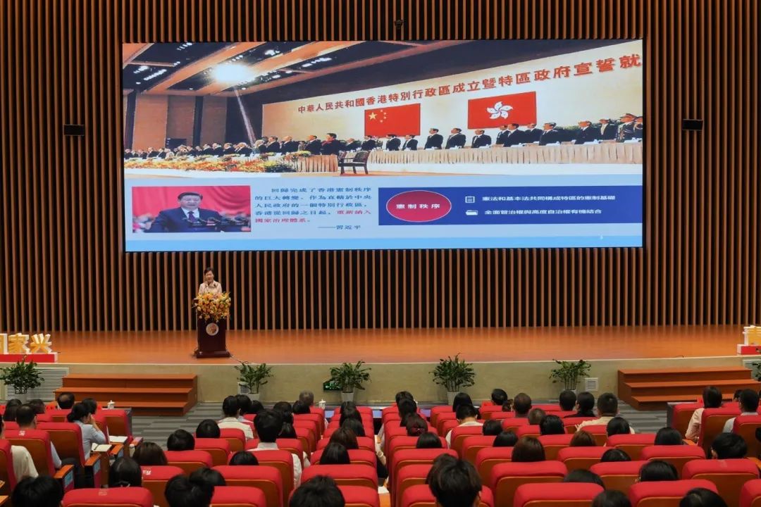 林郑月娥女士以“坚持和完善‘一国两制’在香港的实践”为主题,从历史纵深、实践经验与家国情怀出发,深入解析“一国两制”的核心要义。她强调,“香港的命运始终与祖国紧密相连”,回归28年来,香港依托国家支持,在法治、经济、民生等领域取得显著成就。同时,她结合自身深耕公职42年的从政经历,阐述中央坚强领导对“一国两制”行稳致远的关键作用,并勉励青年学子胸怀“国之大者”,积极投身国家现代化建设。