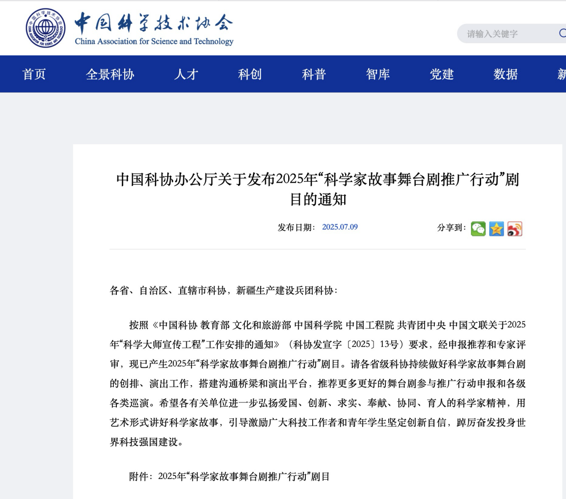 、中国工程院主办的2025年“科学大师宣传工程”之“科学家故事舞台剧推广行动”第一批剧目(长剧)名单,全省唯一、全国30项。