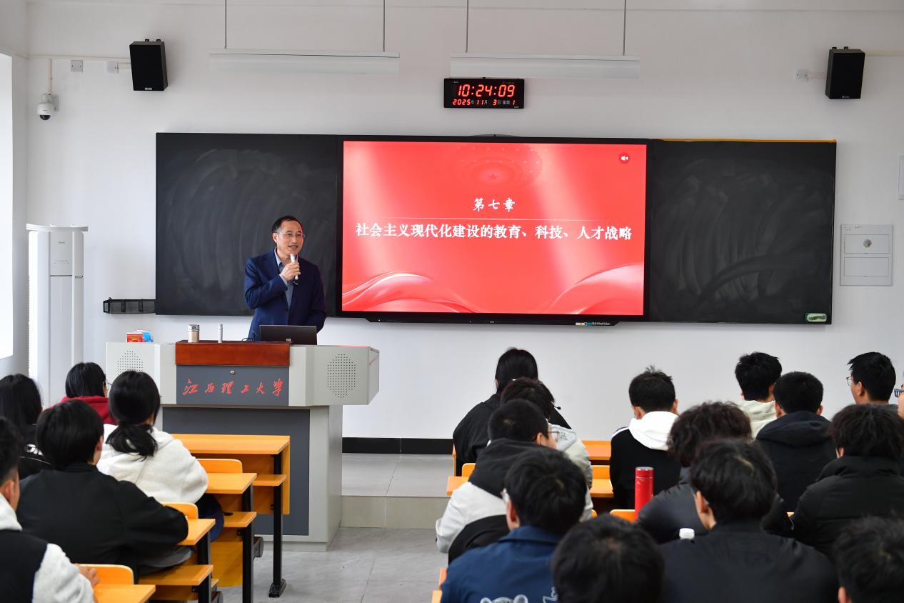 本网讯 11月3日,校党委书记刘祖文在三江校区(西园)阳明楼203教室,为24级金材1班、24级冶金1班学生讲授思政课,向学子们宣讲了党的二十届四中全会精神,共话新时代青年学生的成长与担当。