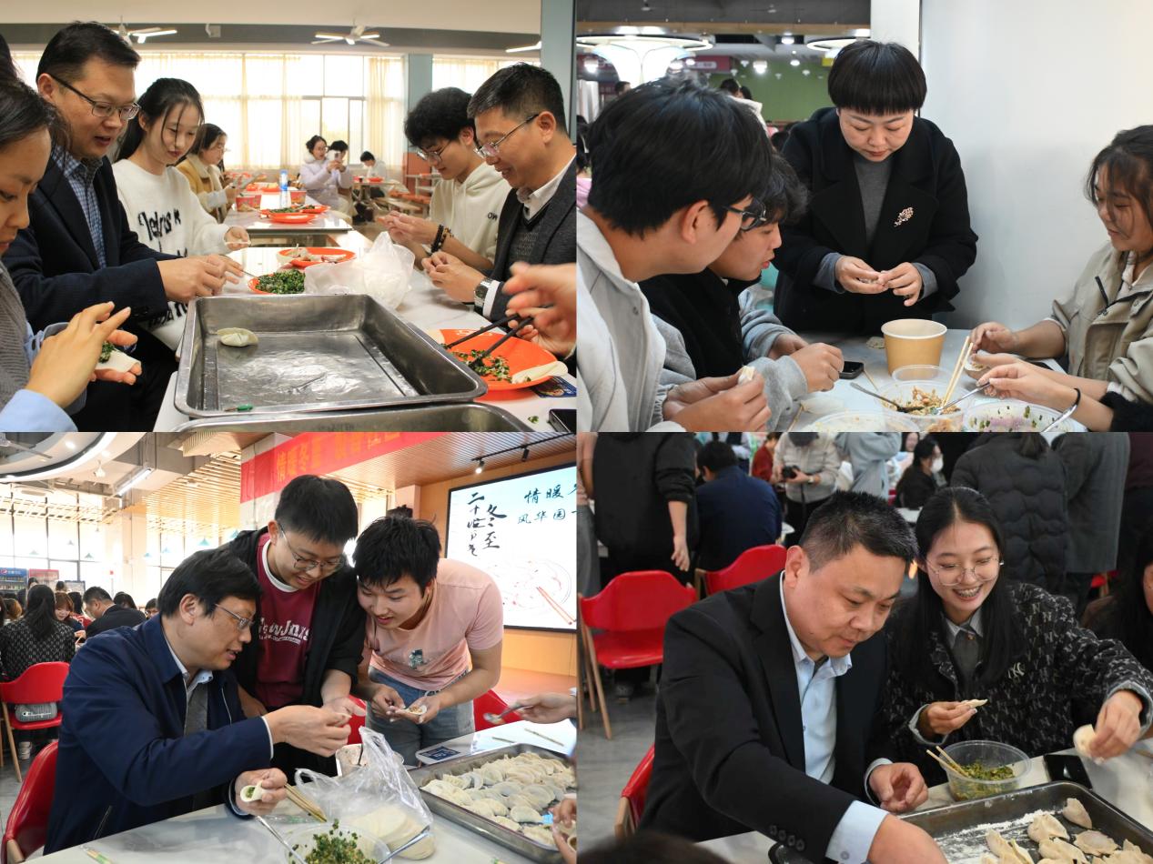 在温馨融洽的氛围中,校领导与老师们走入学生中间,与大家一起擀皮、包馅、煮饺子,亲切交流互动。刘飞在与学生交流时指出,要将清廉文化建设融入社区生活,让风清气正的校园环境与温暖和谐的社区氛围相得益彰。宁洁指出,“一站式”学生社区不仅是生活空间,更是育人阵地,我们要在传统节日中融入劳动教育、文化传承与思政教育等“营养”,培养学生全面发展。熊志华、陈斌、汪锋锁等现场指导同学们开展包饺子趣味比赛,与老师、食堂师傅们一道给同学们盛上热气腾腾的饺子,并与同学们同座品尝美味饺子,共品冬至文化,共话美好青春,祝福同学们天天开心,快乐成才!