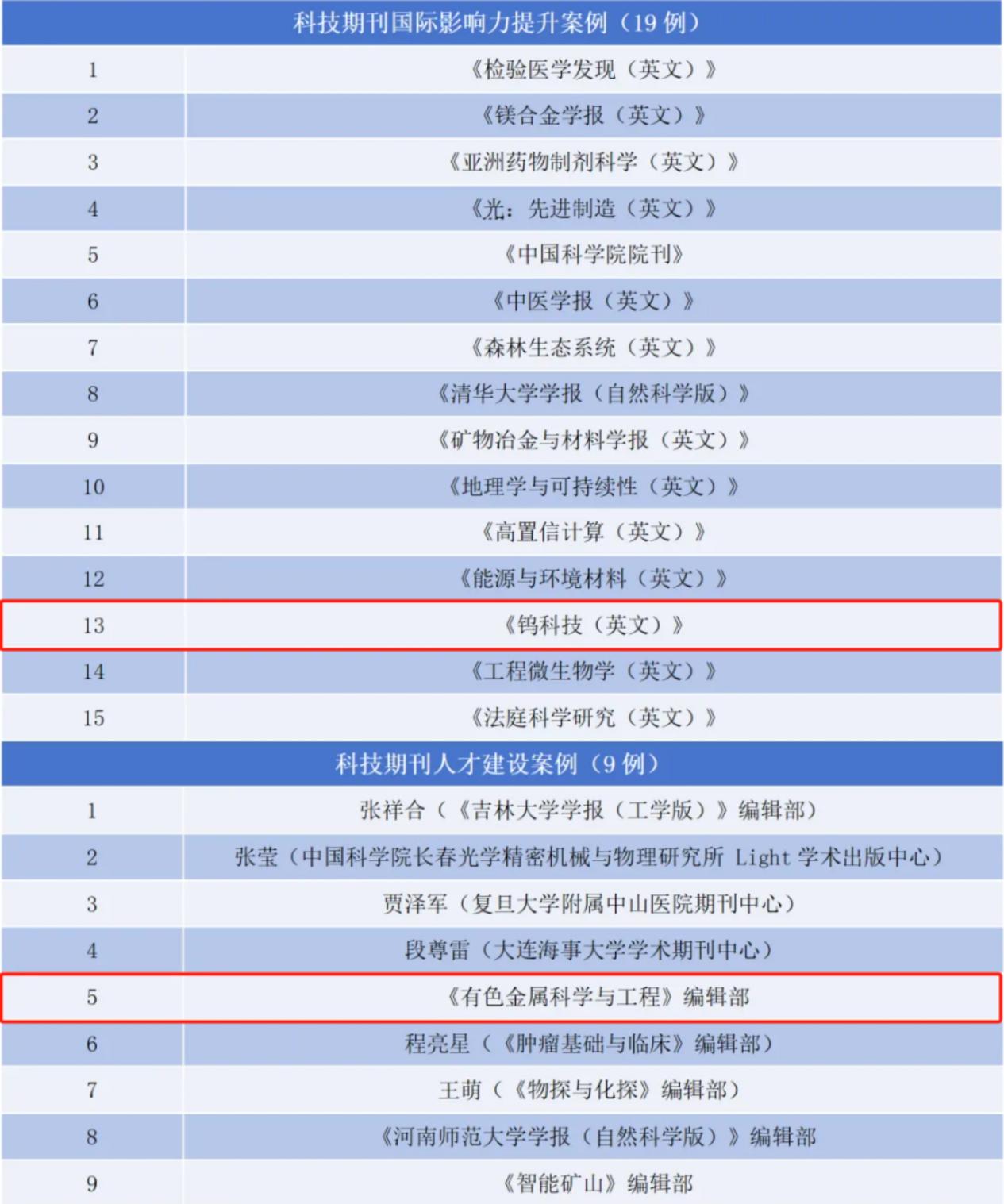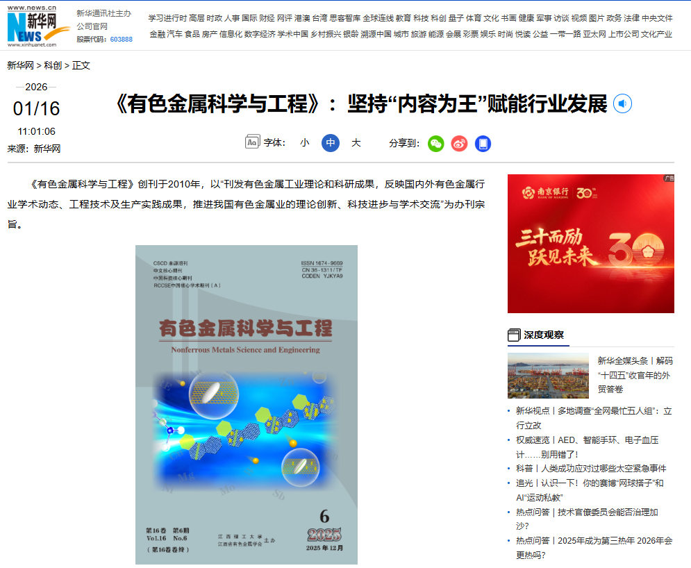 本网讯 近日,由中国高校科技期刊研究会主办,《新华网》提供媒体支持的2025年科技期刊服务高质量创新发展会议在北京举办,会上发布了“2025科技期刊服务高质量创新发展案例征集活动”入选名单,《有色金属科学与工程》入选“科技期刊人才建设案例”,《钨科技(英文)》双双入选“科技期刊国际影响力提升案例”。