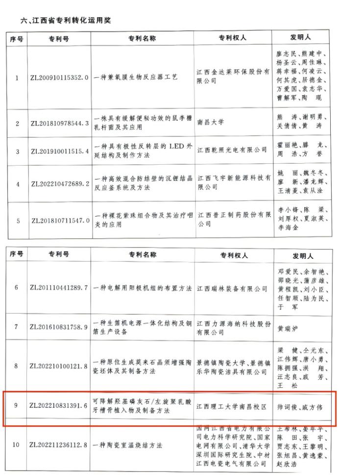 帅词俊教授领衔的生物增材制造团队研发的《可降解羟基磷灰石/左旋聚乳酸牙槽骨植入物及制备方法》(专利号:ZL202210831391.6)斩获江西省专利转化运用奖。团队负责人帅词俊、戚方伟带领团队,凭借兼具生物相容性与可降解性的核心技术,为口腔医疗植入领域的临床应用提供了关键支撑。