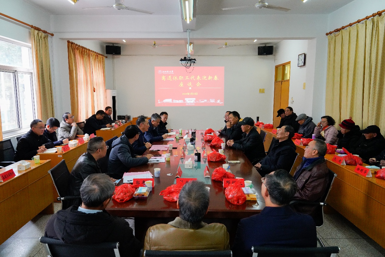 在红旗校区老年活动中心202会议室举办2026年离退休职工代表迎新春座谈会。校党委书记刘祖文,校党委常委、副校长董冰岩,校党委常委、宣传部部长盛晓明及相关职能部门负责人、离退休教职工代表欢聚一堂,迎新春话发展。座谈会由董冰岩主持。