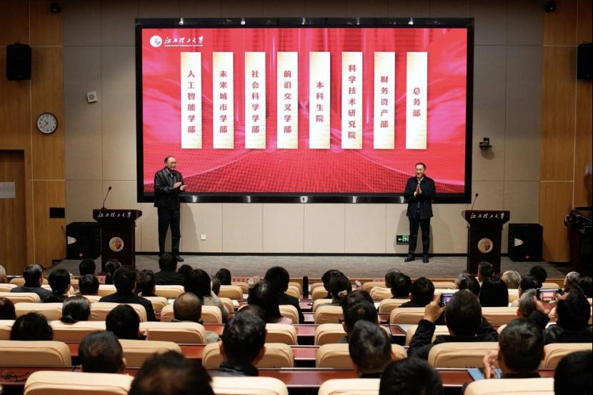 二级机构调整宣布大会暨2026年度“高质量发展成效”考核目标任务书签订仪式在三江校区启航会议中心举行。校党委书记刘祖文,中国工程院院士、校长葛世荣出席会议并讲话。全体在家校领导、党委常委,全校中层干部参加会议,见证签订仪式。