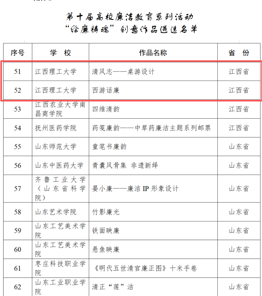 其中,《清风志--桌游设计》作品入选“绘廉铸魂”创意作品遴选名单,《西游话廉》作品入选“绘廉铸魂”创意作品遴选名单,“苏区精神展馆”入选“传廉促担当”廉洁文化地图素材,入选总数并列全省第一。