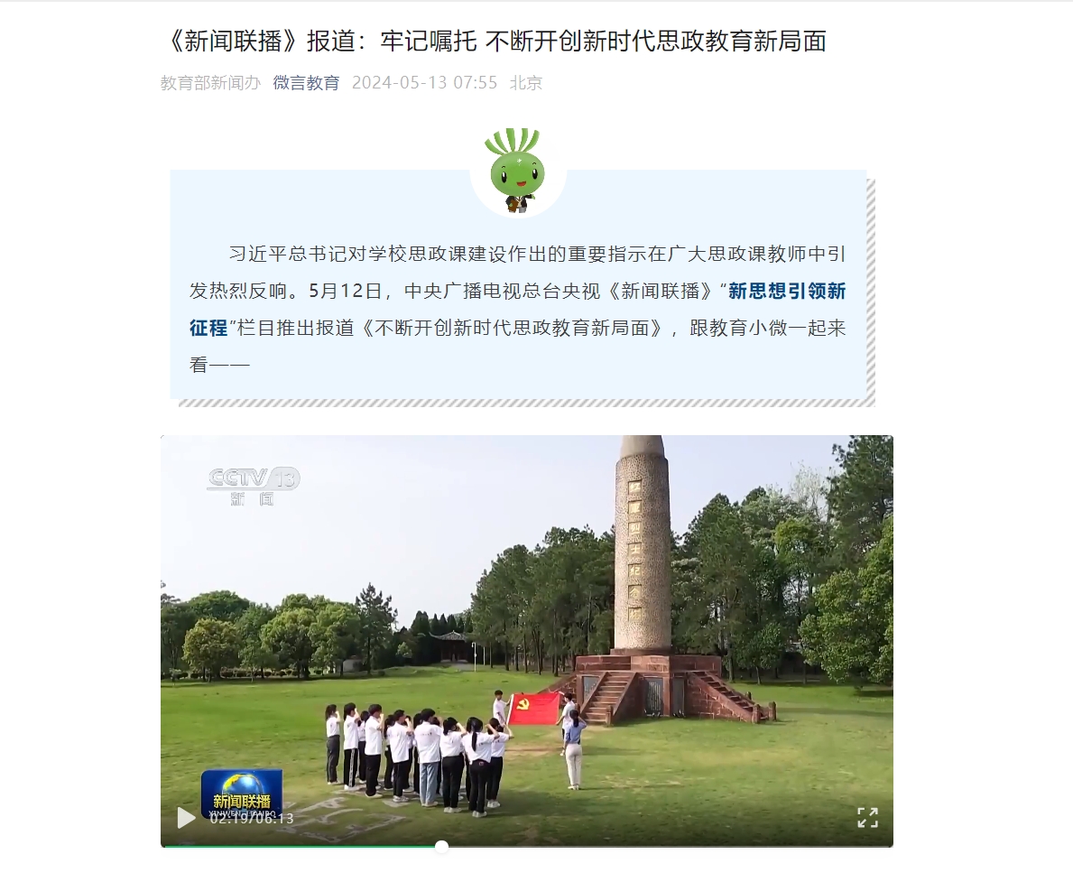 思政课建设作出的重要指示在广大思政课教师中引发热烈反响。5月12日,中央广播电视总台央视《新闻联播》“新思想引领新征程”栏目推出报道《不断开创新时代思政教育新局面》,跟教育小微一起来看——
