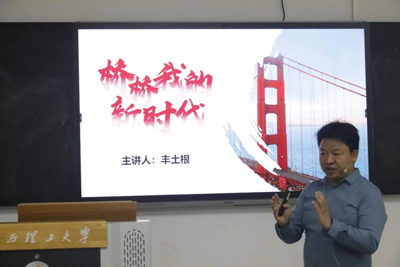 “古代桥梁大约有几种?”“我国桥梁建设技术如何发展变化?”丰土根教授以历史为经纬,以桥梁科技为线索,为同学们展开讲授。“古代桥梁有浮桥、栈道、悬桥……”“在我国古代桥梁中保存完好强梁有赵州桥、宋代的泉州洛阳桥,钱塘江大桥……”从古代桥梁的种类,到保存完好的桥梁介绍,丰土根教授回顾了我国古代与当代桥梁建设的辉煌成就,介绍了我国不同历史时期具有代表性的著名桥梁和宏伟桥梁工程,让学生感受到我国路桥的悠久历史以及发展速度。他指出,随着现代科技飞速发展,桥梁建筑技术日臻完善,桥梁不只建在河江之上,还早已延伸至大海、平原和高山,桥路相通、桥隧相连,跨越更大空间,连接更远世界,创造出一个个伟大的工程奇迹。