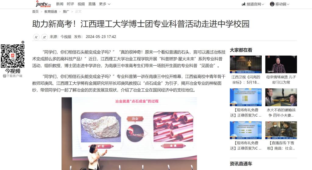 贯彻“走出高校、走进校园”的理念,紧跟江西新高考政策的步伐,依托“神奇的稀土”江西省科普教育基地与多个国家、省市重点实验室,着力开展中小学学科、专业、科技等方面的科普宣传活动,帮助少年进行专业选择与发展规划,为国家科技兴国、人才强国战略的实施注入新动能、新血液。(图文 刘东佶、任天利、陈琰)