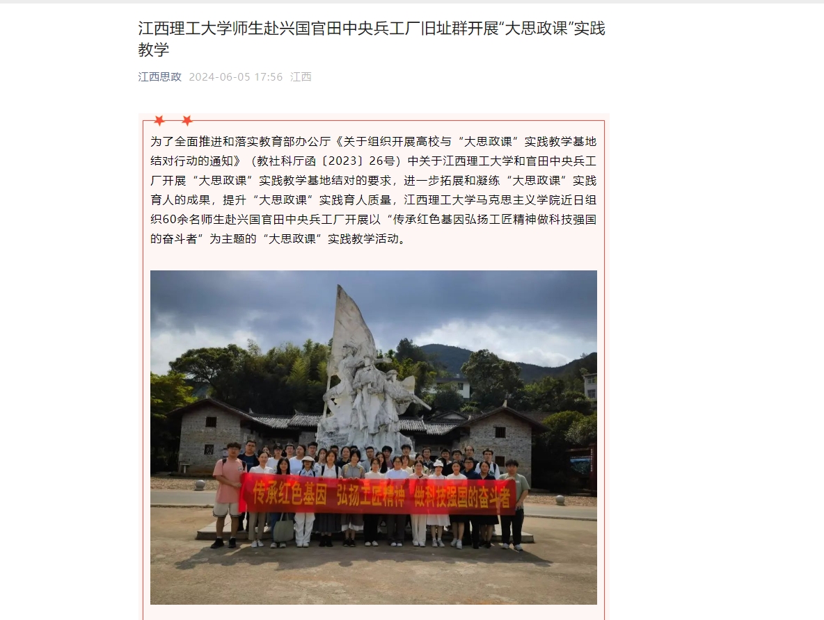 近日组织60余名师生赴兴国官田中央兵工厂开展以“传承红色基因弘扬工匠精神做科技强国的奋斗者”为主题的“大思政课”实践教学活动。