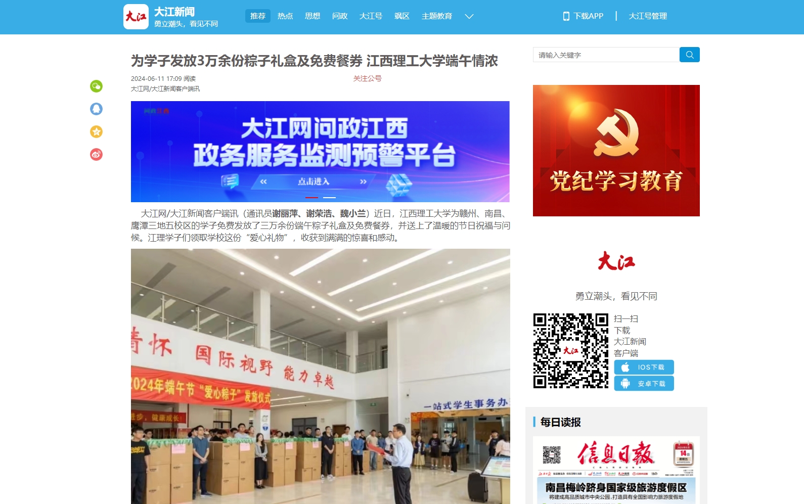 为赣州、南昌、鹰潭三地五校区的学子免费发放了三万余份端午粽子礼盒及免费餐券,并送上了温暖的节日祝福与问候。江理学子们领取大发娱乐