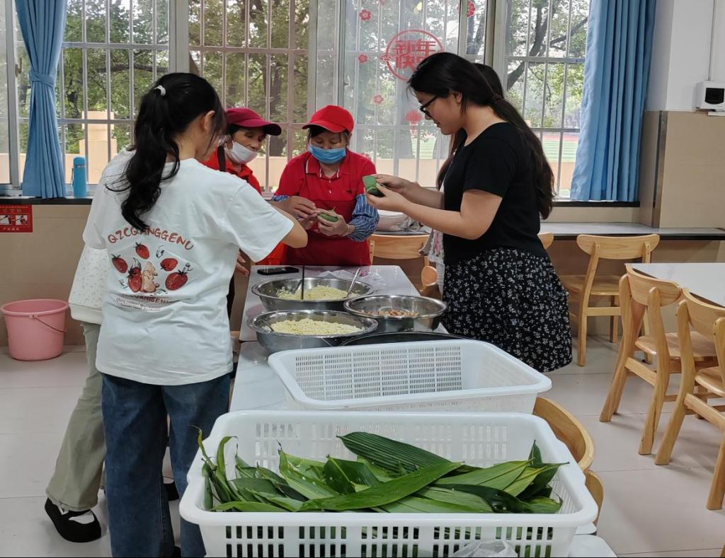 的温暖关怀,各个食堂还联合学工部组织食堂员工和学生一起进行包粽子活动。洗粽叶、折粽叶、填糯米、放馅料、封口子、扎藤绳……粽叶层层叠叠,包裹着精心挑选的米与馅,满载着欢声笑语。