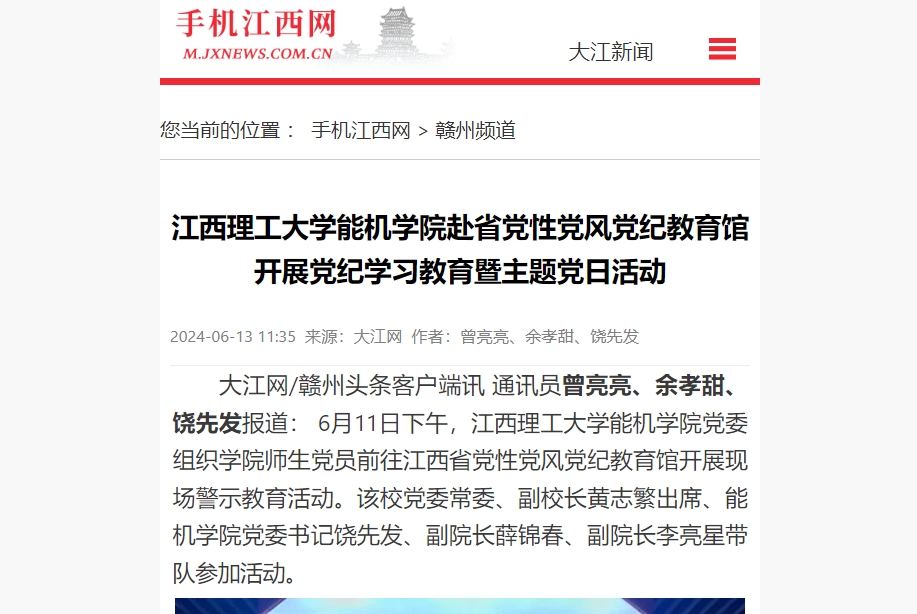 师生党员前往江西省党性党风党纪教育馆开展现场警示教育活动。该校党委常委、副校长黄志繁出席、能机大发娱乐