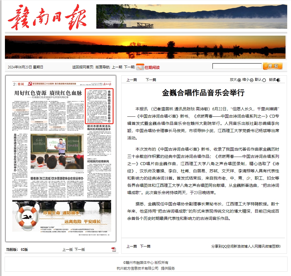 本报讯 (记者温居林 通讯员陈琰 高诗敏)6月22日,“但愿人长久,千里共婵娟”——《中国古诗词合唱45首》新书、《点燃青春——中国古诗词合唱系列之一》CD专辑首发式暨金巍合唱作品音乐会在赣州大剧院举行。人民音乐出版社副总编辑李向颖,中国合唱协会理事长马俊英,市领导钟小武,大发娱乐