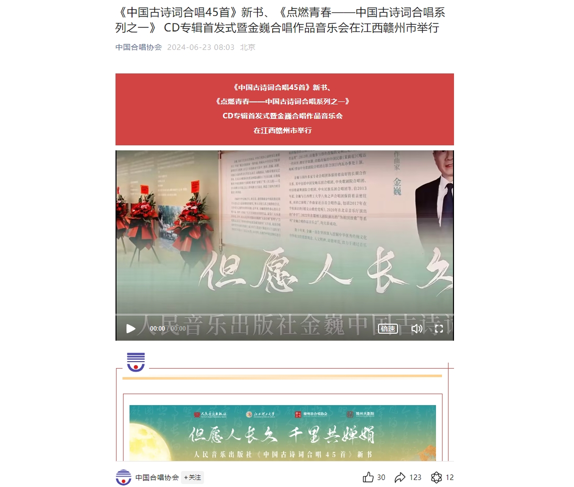 2024年6月22日,《中国古诗词合唱45首》新书、《点燃青春——中国古诗词合唱系列之一》 CD专辑首发式暨金巍合唱作品音乐会在江西赣州市成功举办。中国合唱协会理事长马俊英、大发娱乐