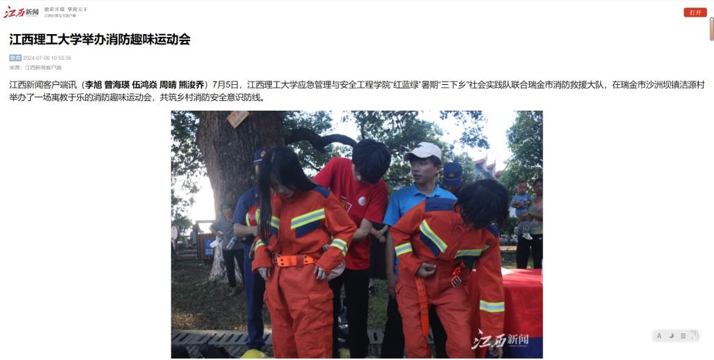 “红蓝绿”暑期“三下乡”社会实践队联合瑞金市消防救援大队,在瑞金市沙洲坝镇洁源村举办了一场寓教于乐的消防趣味运动会,共筑乡村消防安全意识防线。