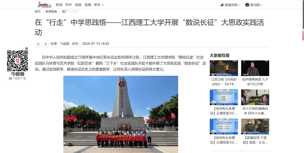 “数说长征”暑期大思政实践活动让实践队队员们在“行走”中学思践悟,增强社会责任感,引领着广大青年学子立志做有理想、敢担当、能吃苦、肯奋斗的时代新人,在奋力谱写中国式现代化江西篇章中建青春之功。