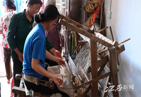 鸣机织苎,经纬流芳。从一团乱麻到一匹坯布,经纬纵横穿梭间时光荏苒,夏布承载着一代代赣南客家人的情感与乡愁,也延续着这千年传统手工技艺的魅力与芬芳。夏布完全由手工织造,工序复杂,体现了工匠精神。一个织布动作要恰当地控制好力度与速度,并非易事。参访当天,大家既心生自豪,也深切感受到了夏布手艺人的辛苦。“自己上手的感觉真的完全不一样,织布的时候不仅要用眼睛观察,还要注意手脚配合。”实践队员刘慧红感叹道。