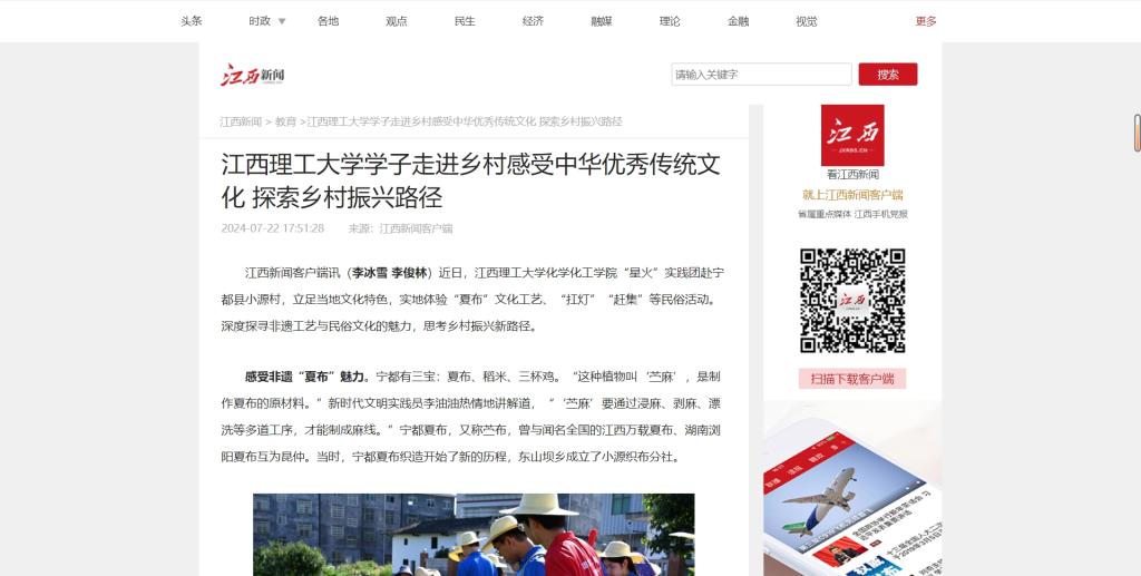“星火”实践团赴宁都县小源村,立足当地文化特色,实地体验“夏布”文化工艺、“扛灯”“赶集”等民俗活动。深度探寻非遗工艺与民俗文化的魅力,思考乡村振兴新路径。
