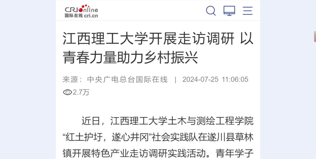 “红土护圩,遂心井冈”社会实践队在遂川县草林镇开展特色产业走访调研实践活动。青年学子深入基层,了解当下乡镇发展现状,为服务乡村振兴贡献青春力量。
