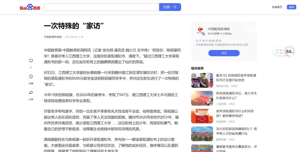 录取通知书的那一刻,这位坐在轮椅上的腼腆男孩露出了灿烂的笑容。