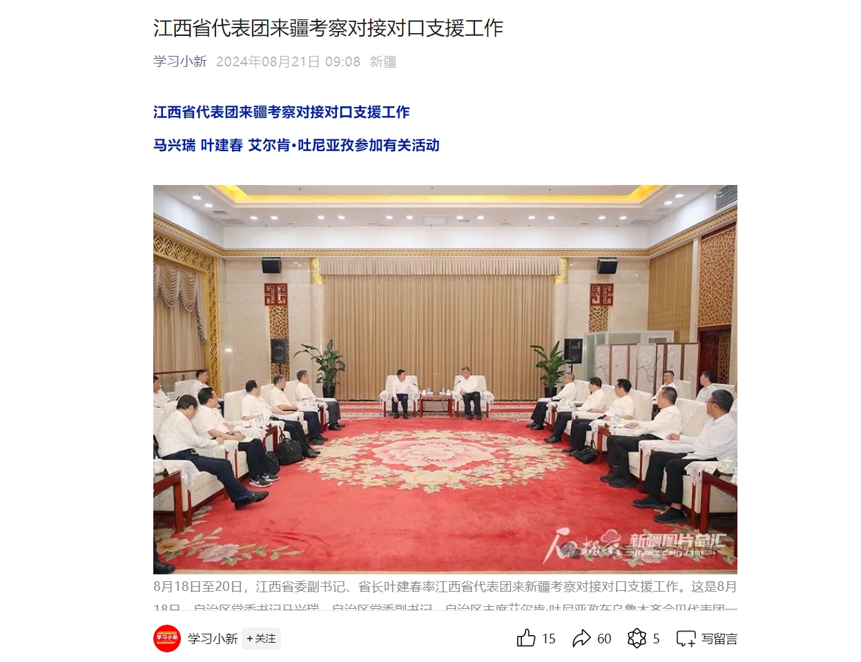 8月18日至20日,江西省代表团来新疆考察对接对口支援工作。自治区党委书记马兴瑞,自治区党委副书记、自治区主席艾尔肯·吐尼亚孜18日在乌鲁木齐会见江西省委副书记、省长叶建春,围绕落实习近平总书记和党中央关于对口援疆工作决策部署深入交流,携手推动新时代对口援疆工作取得新进展、新赣深度合作开创新局面。