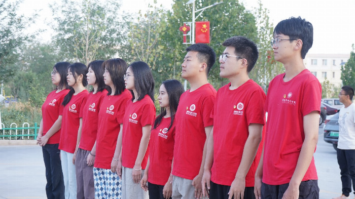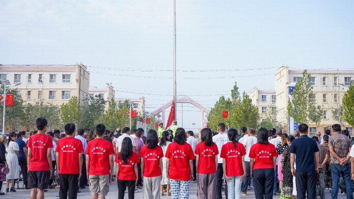 迎着清晨的第一缕阳光,实践队员们排着整齐的队伍,在恰尔隆镇政府大院前,等待着庄严的升旗仪式开始。