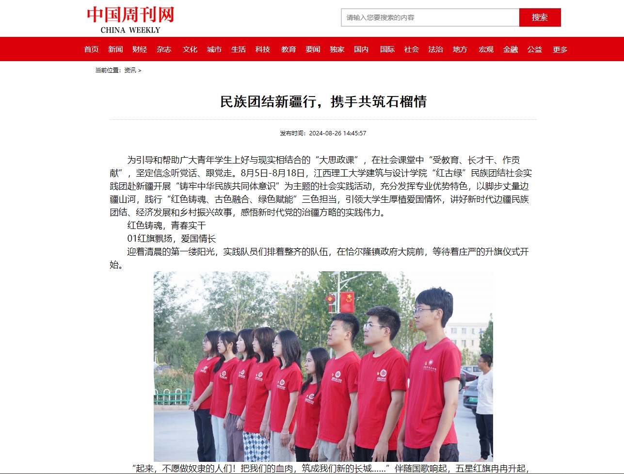 “红古绿”民族团结社会实践团赴新疆开展“铸牢中华民族共同体意识”为主题的社会实践活动,充分发挥专业优势特色,以脚步丈量边疆山河,践行“红色铸魂、古色融合、绿色赋能”三色担当,引领大学生厚植爱国情怀,讲好新时代边疆民族团结、经济发展和乡村振兴故事,感悟新时代党的治疆方略的实践伟力。