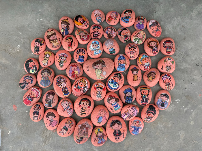 同时,实践队员们将各民族服饰描绘在石子上,摆出中国地图的造型,如同56个民族像石榴籽一样紧密抱在一起不可分割。