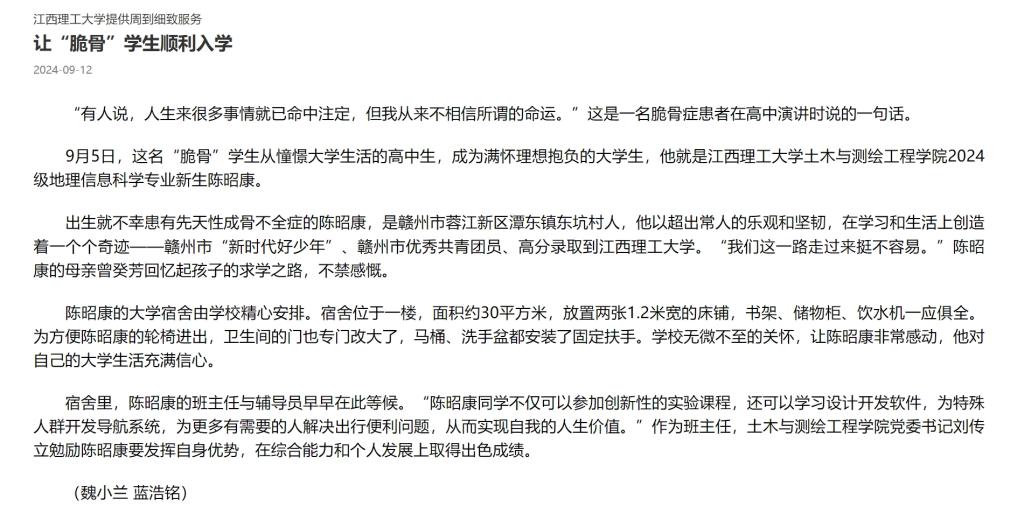“有人说,人生来很多事情就已命中注定,但我从来不相信所谓的命运。”这是一名脆骨症患者在高中演讲时说的一句话。