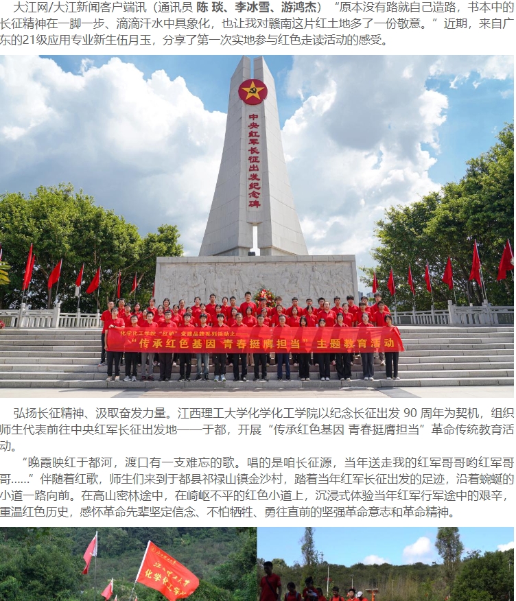 以纪念长征出发 90 周年为契机,组织师生代表前往中央红军长征出发地——于都,开展“传承红色基因 青春挺膺担当”革命传统教育活动。