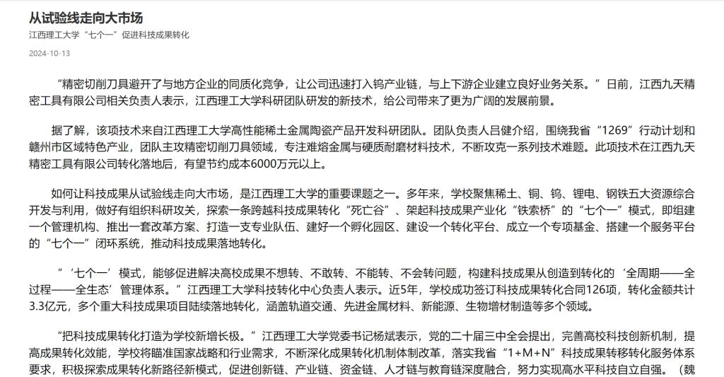 聚焦稀土、铜、钨、锂电、钢铁五大资源综合开发与利用,做好有组织科研攻关,探索一条跨越科技成果转化“死亡谷”、架起科技成果产业化“铁索桥”的“七个一”模式,即组建一个管理机构、推出一套改革方案、打造一支专业队伍、建好一个孵化园区、建设一个转化平台、成立一个专项基金、搭建一个服务平台的“七个一”闭环系统,推动科技成果落地转化。