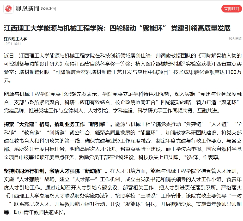 在科技创新领域屡创佳绩:帅词俊教授团队的《可降解骨植入物的可控制备与功能设计研究》获得江西省自然科学奖一等奖;植入医疗器械增材制造实验室获批江西省重点实验室;增材制造团队“可降解复合材料增材制造工艺开发与应用中试项目”技术成果转化金额高达1100万元。