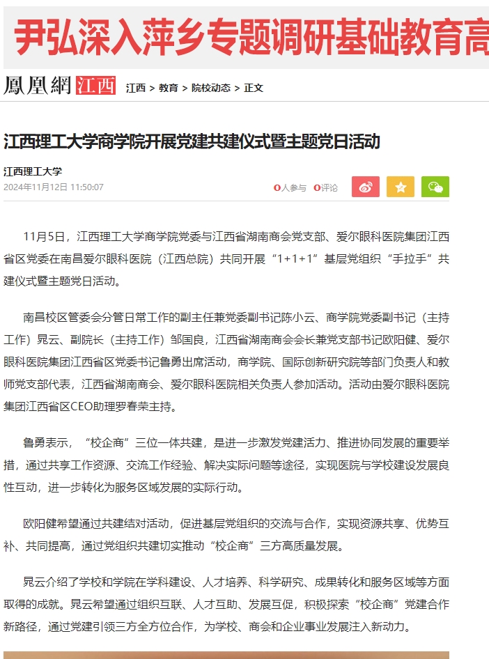 、国际创新研究院等部门负责人和教师党支部代表,江西省湖南商会、爱尔眼科医院相关负责人参加活动。活动由爱尔眼科医院集团江西省区CEO助理罗春荣主持。
