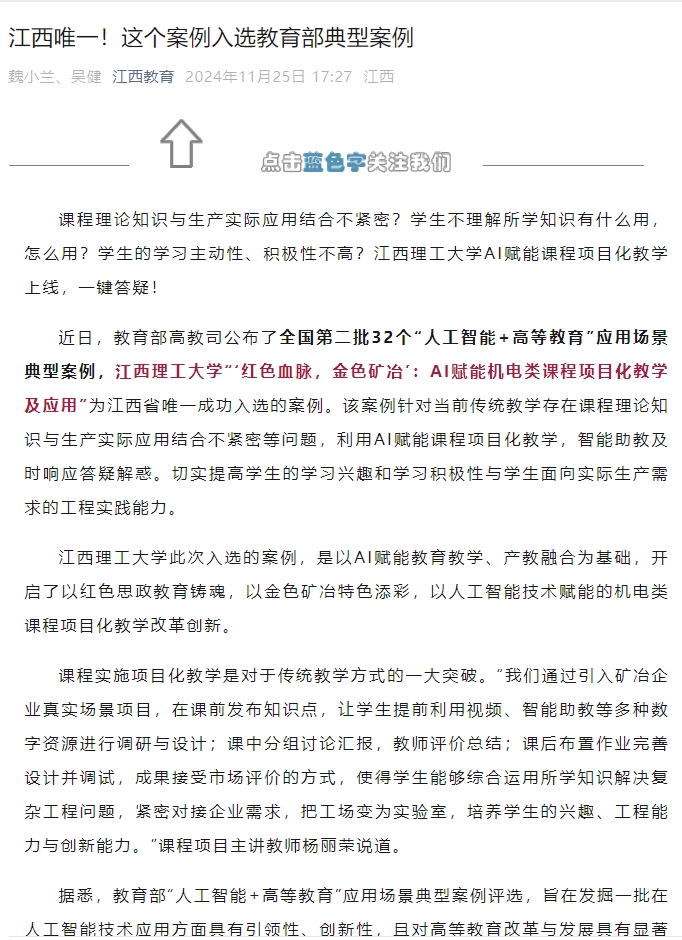 此次入选的案例,是以AI赋能教育教学、产教融合为基础,开启了以红色思政教育铸魂,以金色矿冶特色添彩,以人工智能技术赋能的机电类课程项目化教学改革创新。课程实施项目化教学是对于传统教学方式的一大突破。“我们通过引入矿冶企业真实场景项目,在课前发布知识点,让学生提前利用视频、智能助教等多种数字资源进行调研与设计;课中分组讨论汇报,教师评价总结;课后布置作业完善设计并调试,成果接受市场评价的方式,使得学生能够综合运用所学知识解决复杂工程问题,紧密对接企业需求,把工场变为实验室,培养学生的兴趣、工程能力与创新能力。”课程项目主讲教师杨丽荣说道。据悉,教育部“人工智能+高等教育”应用场景典型案例评选,旨在发掘一批在人工智能技术应用方面具有引领性、创新性,且对高等教育改革与发展具有显著推动作用的实践案例,从而在更广的范围内发挥示范引领作用,促进人工智能赋能教育教学的创新发展。